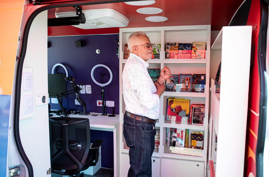 Secretário de Cultura do Tocantins, Tião Pinheiro, durante visita ao MovCeu, projeto itinerante que fortalece o acesso à arte, leitura e inovação em municípios do interior do estado - Maria Eduarda Ferraz / Governo do Tocantins